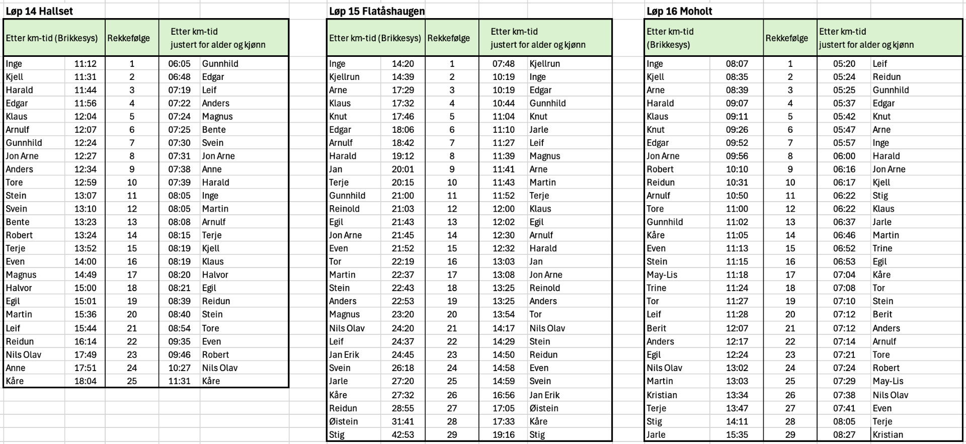 Resultatene vil bli mer "rettferdige" dersom løpernes km-tid justeres for alder og kjønn med en tilpasning av alderskurvene som benyttes i Bedriftsløpene, se figuren. Den viser f.eks at en gubbe på 82 år og en gubbinne på 71 år kan ha dobbelt så lang målt km-tid som en ungdom på 35 år og likevel få samme justerte km-tid. Selv om gubbeløpene "bare" har et aldersspenn fra ca 55 til 85+ gir en slik alderskorreksjon betydelige utslag på rekkefølgen som vist for 3 løp nedenfor.